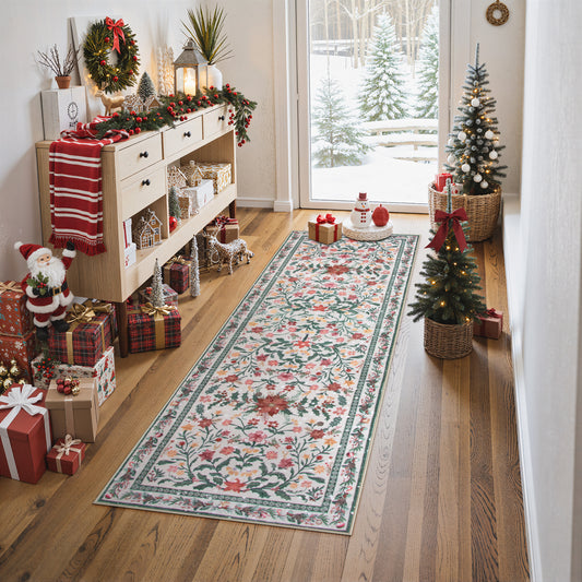 Lahome Christmas Rug, Vintage Rugs for Living Room, Washable Boho Bedroom Rug Non Slip Floral Mat, Soft Non Shedding Indoor Carpet for Kitchen Foyer Office Holiday Decorationation,Cream