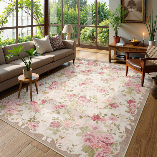 Lahome Decor Vintage Floral Area Rugs,Large Rugs for Living Room Boho Area Rug Machine Washable, Low Pile Pink Rugs for Bedroom Girls Carpet for Nursery Rug Playroom Dining Room