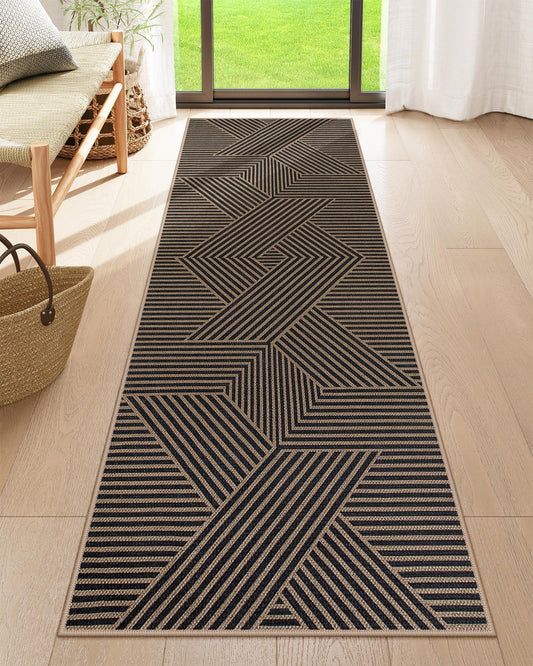 RUG ROBOT Modern Geometric Easy Jute Area Rug, Washable Indoor Rugs for Living Room Bedroom Entryway Rug Non Slip, Black Farmhouse Outdoor Carpet for Patio Courtyard Bedroom
