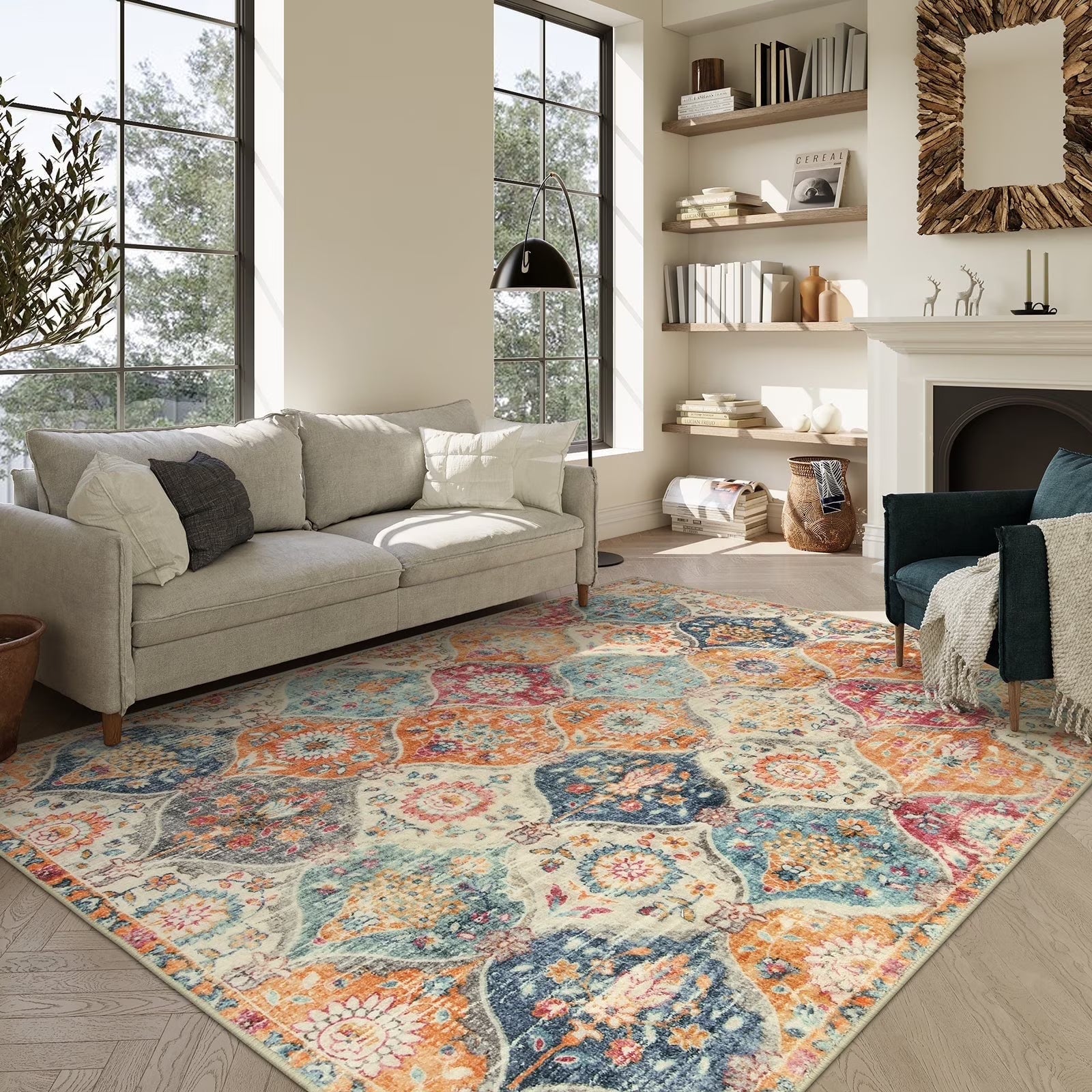 Create a living room full of relaxed charm with the Moynesa moroccan large washable area rug. Featuring a stylish vintage faded style and a unique Moroccan floral pattern design, the soft washable rug delivers a rich, exotic look that complements moroccan, bohemian, vintage, farmhouse and rustic styles. Made from premium synthetic fibers with a touch comparable to wool, this living room rug offers the ultimate in softness and comfort. The woven edges and TPE rubber backing not only ensure a non-slip finish, but also provide excellent tear resistance, keeping the moroccan rug securely fastened to your wood floor and protecting it. With a pile height of 0.16 inches, our bedroom rug prevents dust and pile retention and is easy to clean, plus it prevents scratching and chewing by children and pets. The unique low pile design allows this farmhouse rug to be easily placed in entryways and under furniture without hanging over doors or becoming a tripping hazard. This stain and fade resistant rug is available in a variety of sizes, 2'x3' entryway rug,4'x6' living room rug,5x7 bedroom rug and 6x9 dining room rug for smaller living rooms, making them aesthetically pleasing while allowing for a larger space.8x10 large area rugs are suitable for larger living rooms,9'x12' large dining room rug connecting the space together and creating a comfortable seating area. Perfect for high traffic areas such as entryways, living rooms, bedrooms and dining rooms. Our indoor rugs come in folded packaging for easy portability, making it easy to enjoy the softness of the rug! Rugs folded packages may wrinkle temporarily, it is recommended to roll the rug in the opposite direction or press it down with a heavy object to give the folds time to flatten and set.