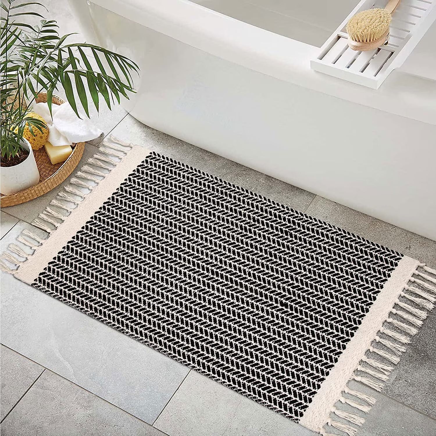 Moynesa farmhouse handmade area rugs bring comfort and beauty to your home. Boho washable rugs are made of lightweight woven cotton, featuring a fishbone bone pattern and handwoven tassels that bring a strong tribal style, adding a vintage charm to your space. The simple black and white color scheme and reversible design make it suitable for most home decor styles, such as farmhouse, contemporary, modern, vintage, scandinavian, traditional, morocco and more. The low pile design of this black and white rug prevents dirt and pet hair from hiding and also resists pet scratching, making it kids & pet friendly. Area rug with tassels comes in three sizes: 2'x3' for small kitchen sink rugs, 2'x6' runner rug for the hallway, and 3'x5' rugs for the entryway. Regularly sweep or vacuum to remove dust, dirt, or debris to keep your bedroom rug clean and tidy.You can also gently wash in cold water and air dry after machine washing.We recommend using a rug pad with our highly absorbent kitchen rugs for better performance. Please note: there may be slight shedding after the first wash due to the handmade nature of the rug; the unbound edges and minor imperfections add to its charm.